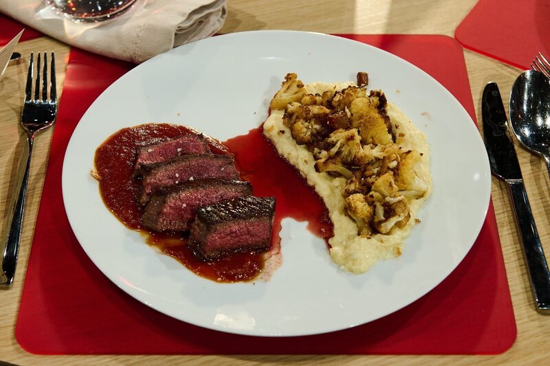 Tagesmotto „Alliterationen": Bürgermeisterstück mit BBQ-Sauce, Blumenkohl aus dem Ofen, Blumenkohlcreme und Butterbrösel von Michael GerhardyBild: © ZDF und Gunnar Nicolaus