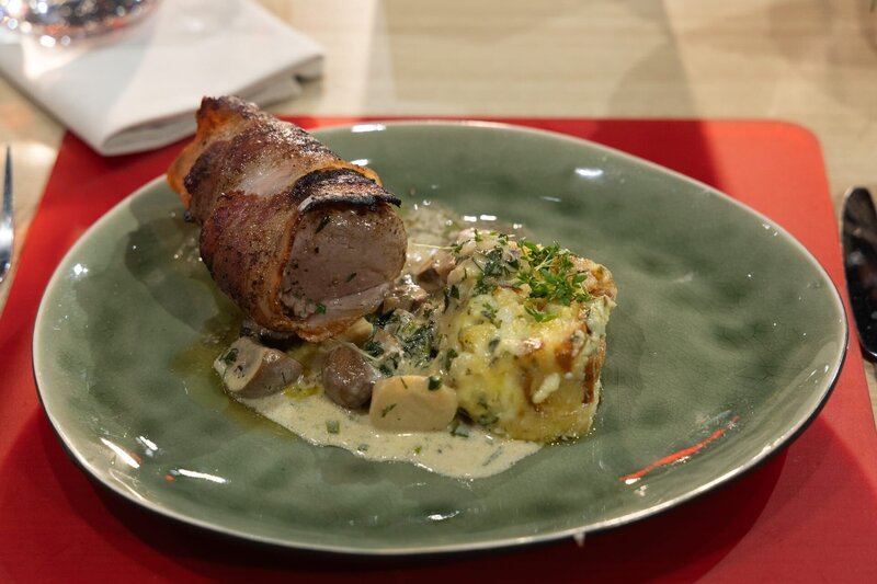Tagesmotto "Leibgericht": Schweinefilet im Speckmantel mit Pilzragout und Käse-Laugenknödel von Ben Rödel.Bild: © ZDF