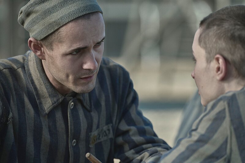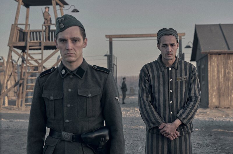 Jonas Nay as Nazi Officer Stefan Baretzki & Jonah Hauer-King as Lali Sokolovin in Auschwitz.
