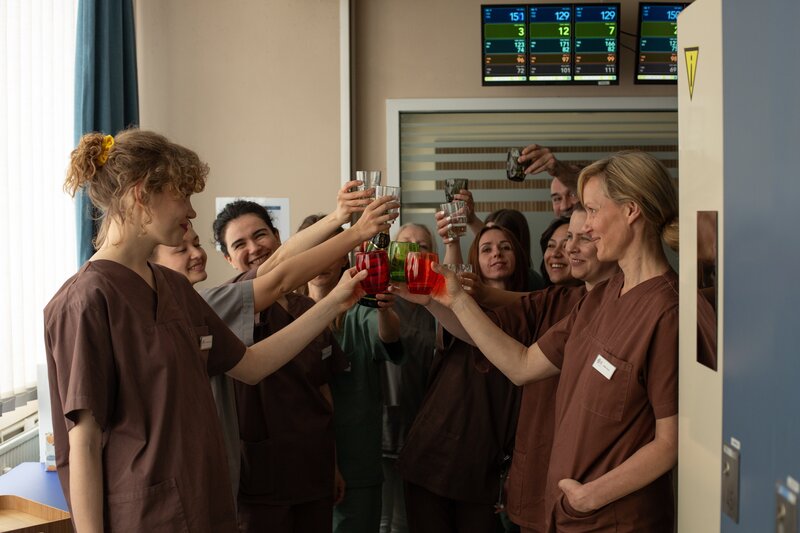 • Greta Malinger (Lydia Lehmann, l.) hatte ihre allererste, eigene Geburt als Hebamme und damit ihre Feuertaufe bestanden. Darauf muss angestoßen werden. Auch Anna (Anna Schudt, r.) und Nalan Arzouni (Mariam Hage, 2.v.l.) sind stolz auf Greta.