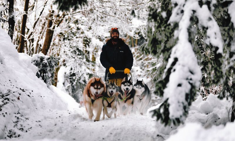 • Dominik Lindebner ist mit seinen Schlittenhunden im Val Saisera unterwegs während Servus TV's "Die Julischen Alpen - Ein Winterparadies mit Meerblick"