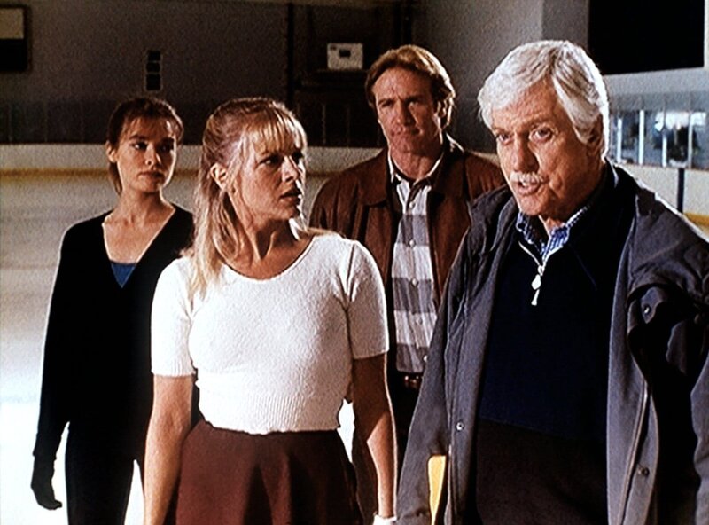 Mark (Dick Van Dyke, r.) und Steve (Barry Van Dyke, 2.v.r.) versuchen zu ergründen, wieso zwischen den Eiskunstläuferinnen Julie (Julie Benz) und Debbie (Robin J. Miller, l.) eine so stark ausgeprägte Rivalität herrscht.