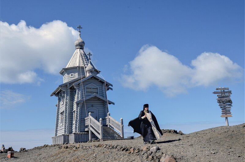 • In der südlichsten russisch-orthodoxen Kirche der Welt auf King George Island lässt Priester Palladiy keine Möglichkeit aus, den Menschen, die in dieser lebensfeindlichen Umgebung leben, Beistand zu leisten.