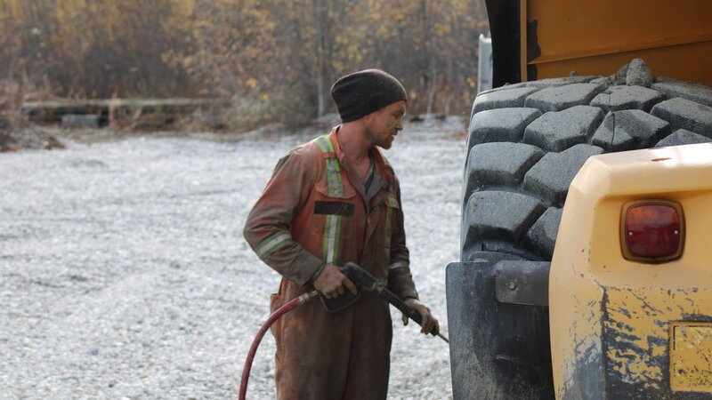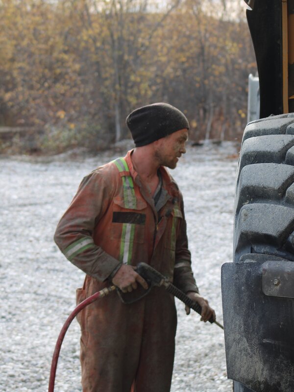 Taylor Matejka benutzt einen Hochdruckreiniger auf einem Lader.
