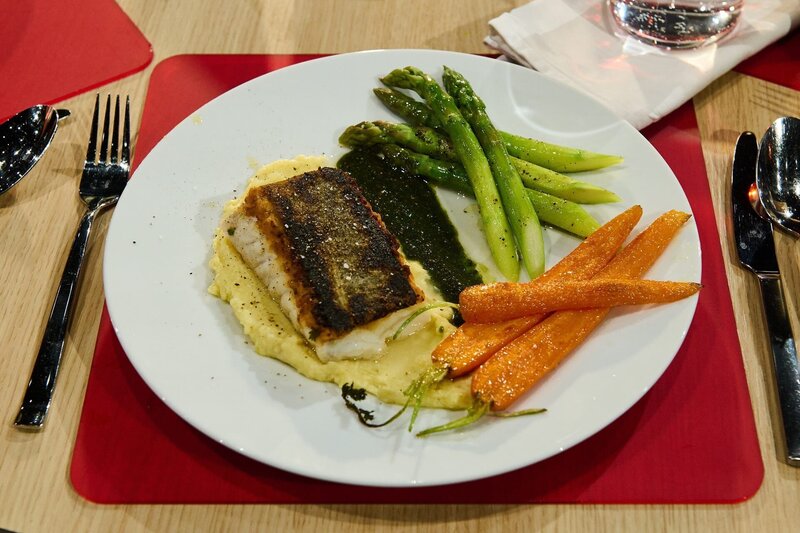 Leibgericht: Gebratenes Kabeljaufilet mit Petersilien-Pesto, Kartoffelpüree, glasierten Möhren und grünem Spargel von Tung Nguyen.Bild: © Gunnar Nicolaus