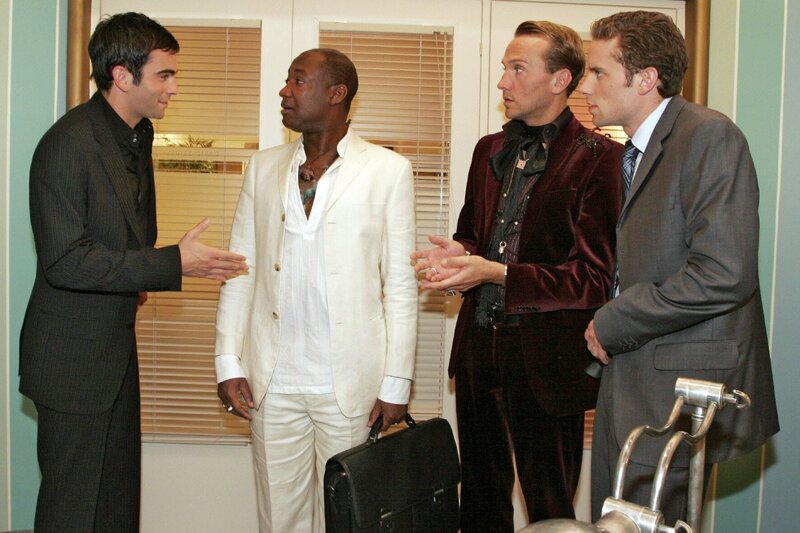 In Lisas Abwesenheit vermasselt David (Mathis Künzler, l.) im Beisein von Hugo (Hubertus Regout, 2.v.r.) und Max (Alexander Sternberg, r.) gründlich das Geschäft mit dem Mondmorchelimporteur Nelson Krüger (John E. Yamoah, 2.v.l.).