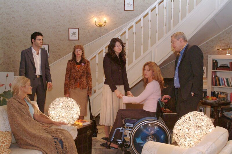 Lisa platzt unbeabsichtigt in Mariellas Abschied von den Seidels. v.l.n.r.: Sabrina (Nina-Friederike Gnädig), David (Mathis Künzler), Lisa (Alexandra Neldel), Mariella (Bianca Hein), Laura (Olivia Pascal), Friedrich (Wilhelm Manske). (Dieses Foto von Alexandra Neldel darf nur in Zusammenhang mit der Berichterstattung über die Serie "Verliebt in Berlin" veröffentlicht und verbreitet werden.)