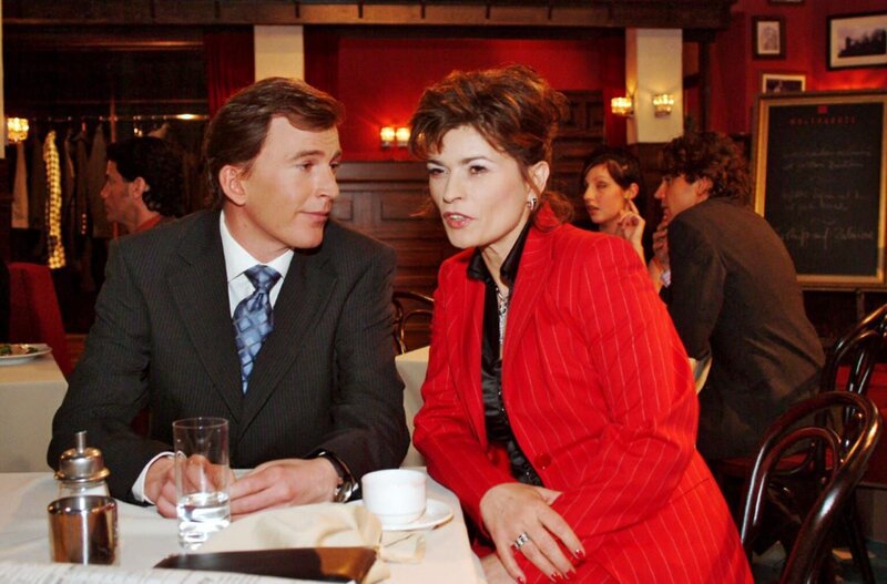 • Helga (Ulrike Mai, r.) ist überwältigt, als Bernd (Volker Herold, l.) sie mit Blumen und einer Liebeserklärung überrascht.