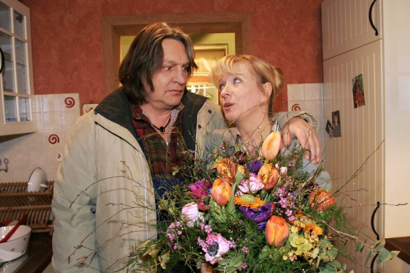 Helga (Ulrike Mai, r.) ist überwältigt, als Bernd (Volker Herold, l.) sie mit Blumen und einer Liebeserklärung überrascht.