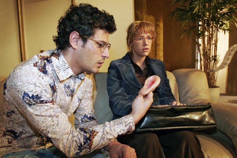 Als ein Päckchen mit Werbegeschenken eintrifft, erschrickt Lisa sich fürchterlich. v.l.n.r.: Rokko Kowalski (Manuel Cortez), Lisa Plenske (Alexandra Neldel).