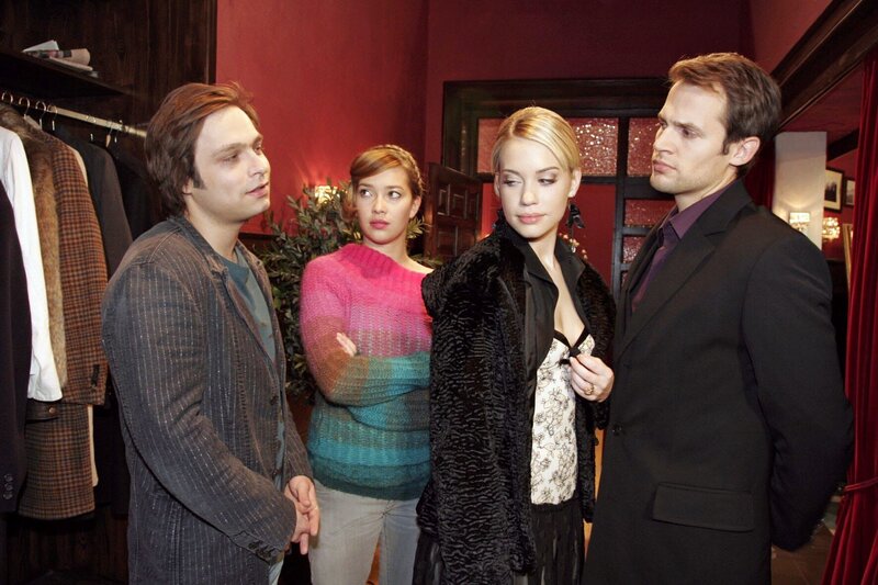 Hannah (Laura Osswald, 2.v.l.) wird bewusst, wie sehr sich Bruno (Tim Sander, l.) in die Schwärmerei für Kim (Lara-Isabelle Rentinck, 2.v.r.) hineingesteigert hat, als sie diese in Begleitung von Paolo (Thorsten Feller, r.) im Wolfhardts antreffen.