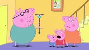 Papa Wutz erhält einen Hüpfestock und zeigt Peppa und ihren Freunden, wie man damit springt. Es ist schwieriger als erwartet und alle haben Schwierigkeiten, außer Peppa, die eine lustige Alternative zum Springen findet: das Springen in Matschepfützen.