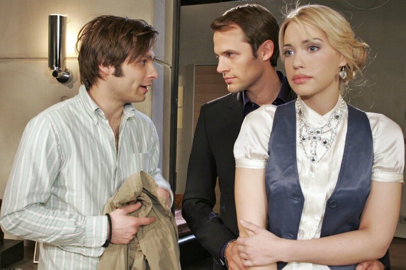 Bruno (Tim Sander, l.) glaubt, dass Kim (Lara-Isabelle Rentinck, r.) mehr Zeit braucht, um sich auch vor Paolo (Thorsten Feller, M.) offiziell zu ihm zu bekennen...