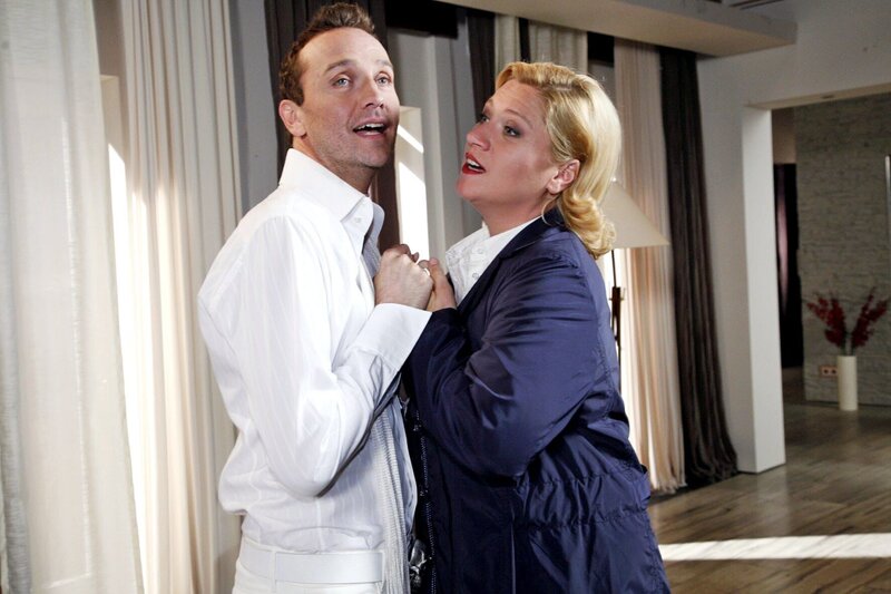 Sophie überrascht bei ihrer Rückkehr in die Firma alle mit ihrem versöhnlichen Kurs. v.l.n.r.: Kim (Lara-Isabelle Rentinck), Paolo (Thorsten Feller), Sophie (Gabrielle Scharnitzky)