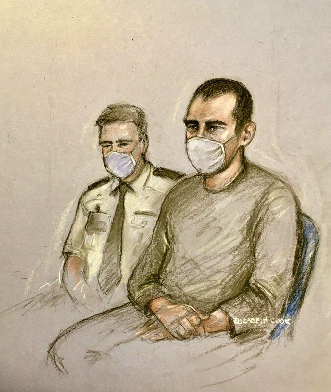 Gerichtsskizze von Elizabeth Cook von Damien Bendall, 31, aus Chandos Crescent, Killamarsh, auf der Anklagebank des Derby Crown Court, angeklagt wegen Mordes an John Paul Bennett, 13, Lacey Bennett, 11, ihrer Mutter Terri Harris, 35, und Laceys Freundin Connie Gent, 11.