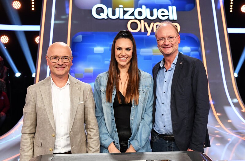 Moderatorin Esther Sedlaczek (M.) mit den Kandidaten des Teams "Wetter": Karsten Schwanke (l.) und Sven Plöger (r.).