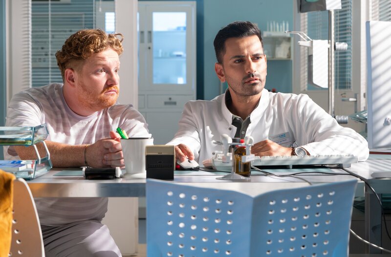 Dr. Ilay Demir (Tan Caglar, re.) hat aufgrund eines Hörbefundes des fast gänzlich erblindeten Dr. Heilmann eine Untersuchung bei Nico Hartmann (Roland Schreglmann, li.) vorgenommen. Als die beiden das Ergebnis auswerten, können sie nicht glauben, was sie da sehen.