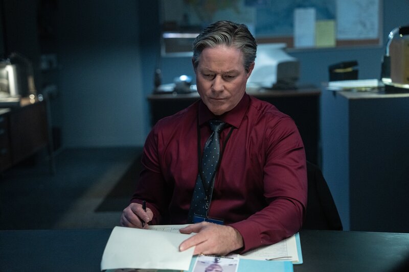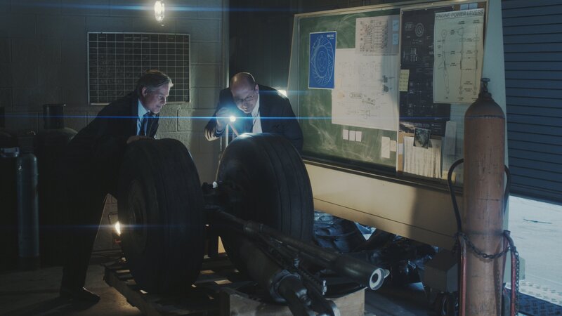 REENACTMENT - Nachdem ein Triebwerksausfall als Ursache für den tödlichen Unfall von Air Transport International Flug 782 ausgeschlossen wurde, untersuchen der leitende Ermittler Bob Benzon (gespielt von Thomas Gordon Marriott) und ein NTSB-Ermittler (gespielt von Sebastian Spence) die Reifen des Flugzeugs auf ungewöhnliche Abnutzung, die auf Probleme mit dem Bremssystem hinweisen könnte. (Cineflix 2023)