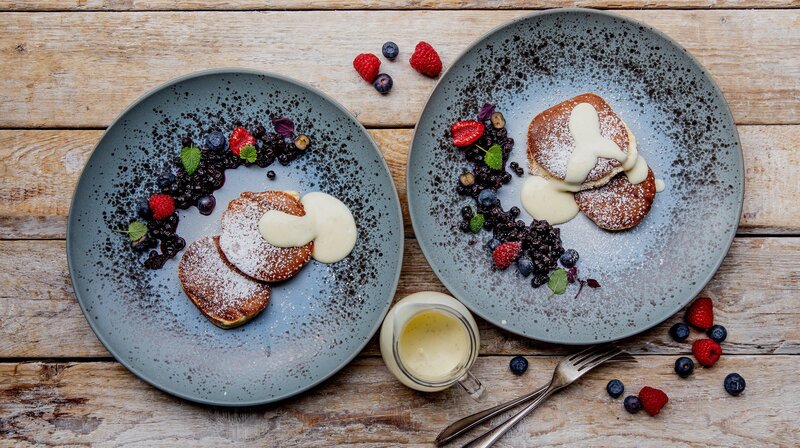 • Soufflee Pancakes mit Blaubeeren und Vanillesoße