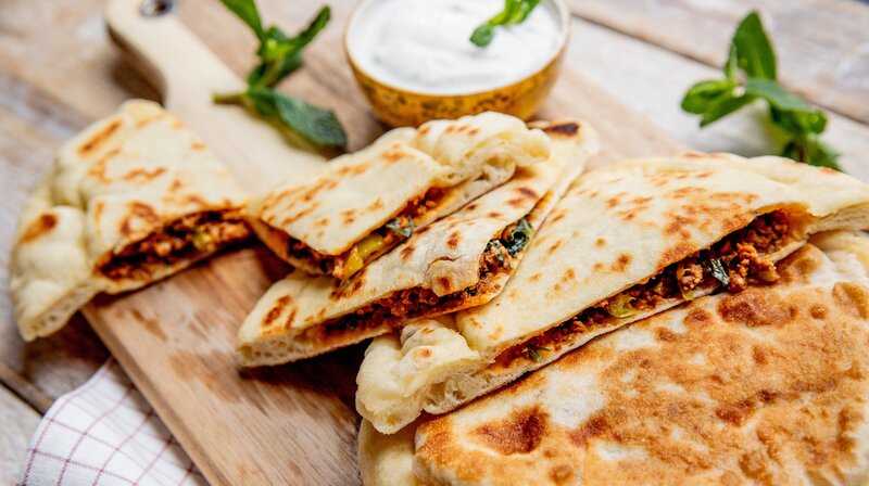 Hefeteig-Pfannkuchen mit Hackfleisch Minze-Dip