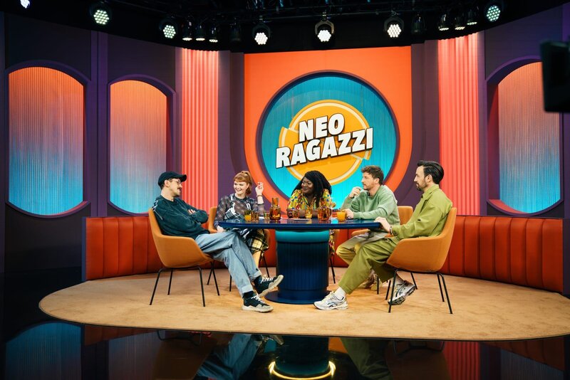 Von links: Der Webvideoproduzent Maximilian Knabe alias "HandofBlood", Moderatorin Sophie Passmann, Schauspielerin Thelma Buabeng, Moderator Tommi Schmitt und der Fernsehmoderator Jan Köppen im Gespräch bei "Neo Ragazzi".