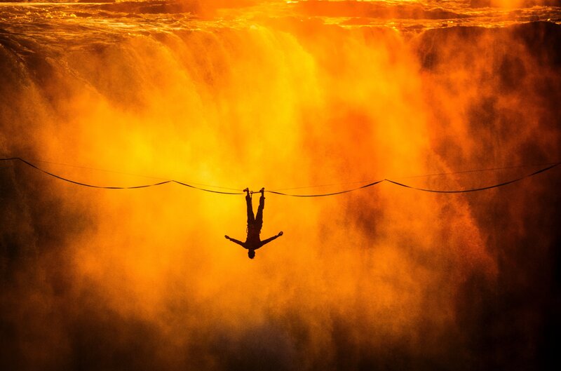 Faszinierende Perspektive – Slackliner Lukas Irmler überquert die Viktoriafälle an der Grenze von Simbabwe und Sambia.