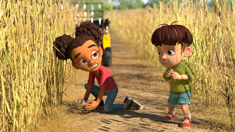 • Kleiner Fuß und Lina haben eine Idee, wie sie die Aufmerksamkeit von Bauer Nölle im lauten Mähdrescher auf sich lenken können.