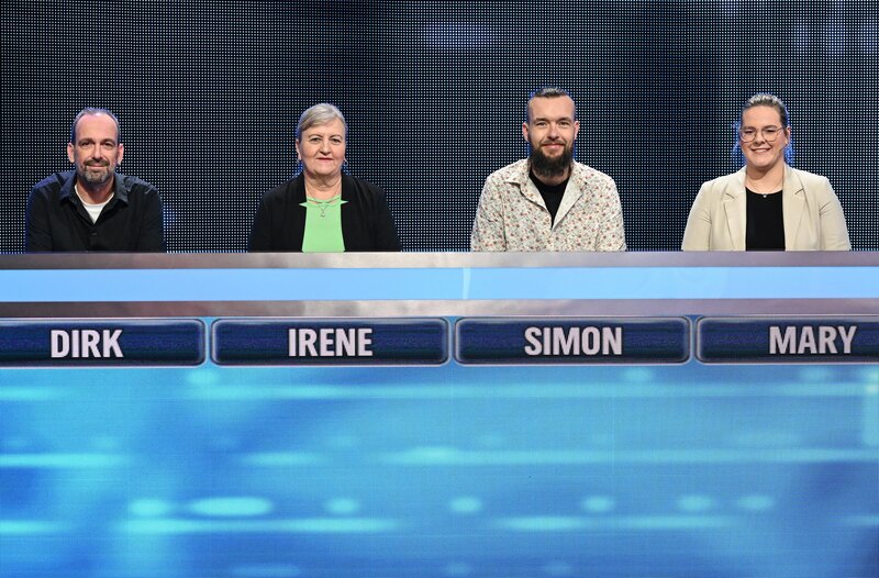 Die Kandidat:innen der Sendung (v.l.n.r.): Dirk Jarius, Irene Merkel, Simon Grantz und Mary Lattner.