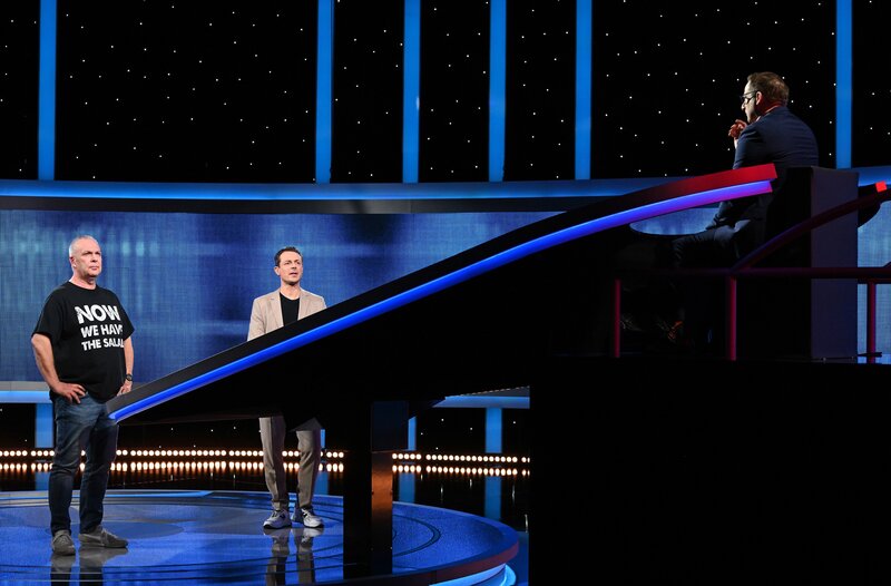 ARD GEFRAGT - GEJAGT FOLGE 754, "Alexander Bommes präsentiert beliebtes Quizformat". Moderator Alexander Bommes mit dem Kandidaten Christoph Klöppel und dem Jäger Dr. Manuel Hobiger.Bild: © ARD/Uwe Ernst