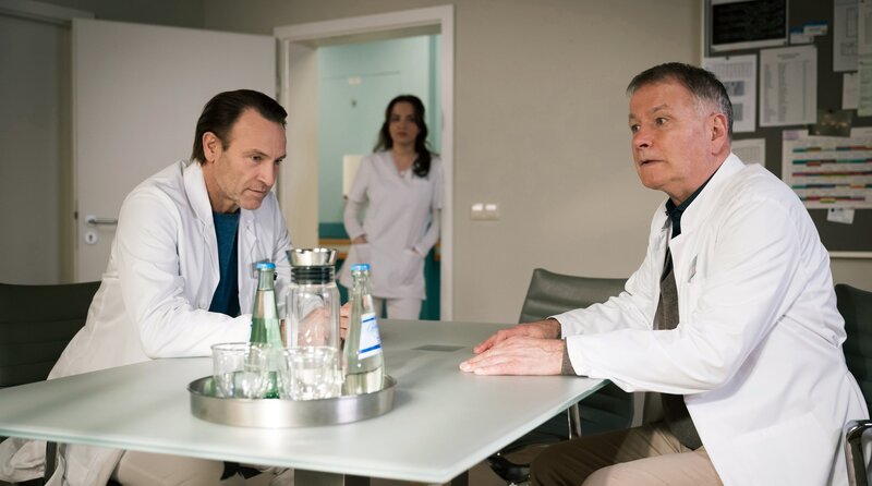 • Martin Stein (Bernhard Bettermann, li.) und Roland Heilmann (Thomas Rühmann, re.) suchen eine Strategie, mit den haltlosen Vorwürfen der sexuellen Belästigung gegen Martin an die Öffentlichkeit zu gehen. Doch dann bietet Jasmin Hatem (Leslie-Vanessa Lill, mi.), die angeblich Betroffene, ihre Unterstützung bei der Pressekonferenz an.