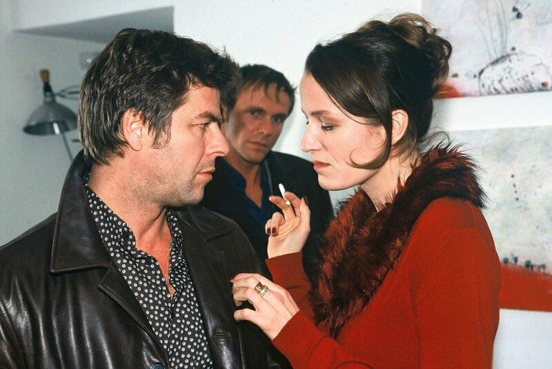 Die "Journalistin" Wolff (Geno Lechner, r.) hat bereits in Sachen Kunstraub in Utrecht recherchiert. Als Jupp (Uwe Fellensiek, l.) und Falk (Dirk Martens, M.) sie befragen, teilt sie ihnen mit, dass der gesuchte Mann unter dem Pseudonym "Leonardo" arbeitet.