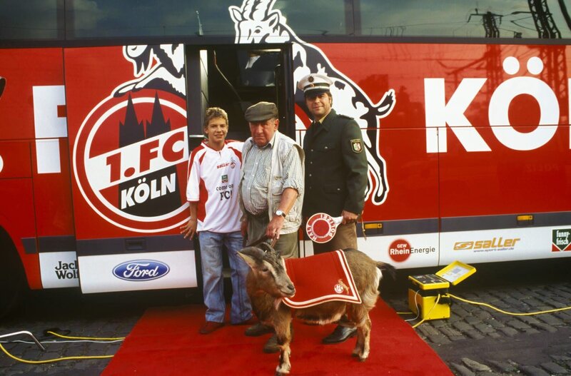 • Flo (Tim Grindau, l.) und Jupp (Uwe Fellensiek, r.) sollen auf ein Foto für die Kampagne "Kölner lassen keinen alleine". Dazu kommen auch noch FC-Geißbock Hennes und Betreuer Wilhelm Schäfer (M.) - was vor allem Flo freut ...