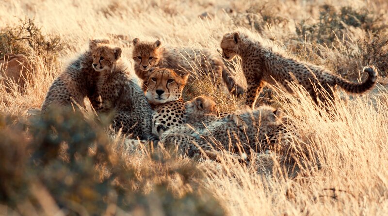 • Die beiden Gepardenweibchen Inara (links) und Chilli (rechts), umgeben von ihren Jungen.