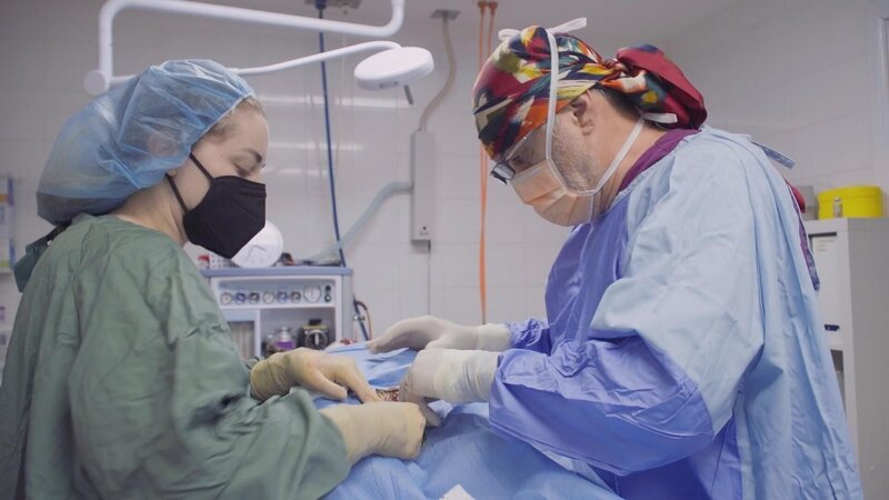 Zwei Tierärztinnen untersuchen den geschwollenen Bauch eines Katers.