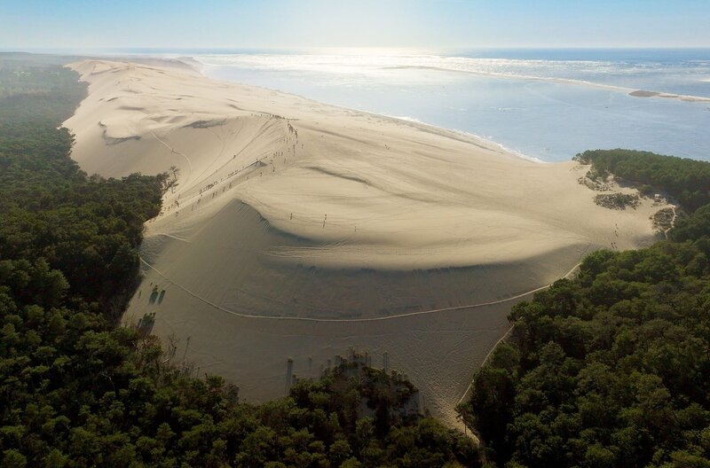 Rund 60 Millionen Kubikmeter Sand, der vom Ozean angespült und durch Westwinde angehäuft wird, türmen sich an Frankreichs Atlantikküste zur Dune du Pilat auf. Angetrieben von starken Winden wandert sie jährlich bis zu fünf Meter ins Landesinnere. Während an der Küste starke Wellen am großen Hügel nagen, schlucken die Sandmassen auf der Landseite immer mehr Bäume. Es ist ein steter Kampf der Vegetation gegen die Erosion.