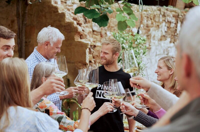 • Zur Begrüßung wird im historischen Innenhof des liebevoll restaurierten, 400-jährigen Innenhof des Weinguts John fröhlich angestoßen – natürlich mit einer Kostprobe aus eigener Herstellung. Mittendrin: Dorotheas Vater Frank und Bruder Sebastian.