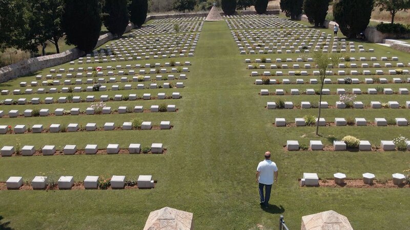 Ein Mann geht über einen Friedhof