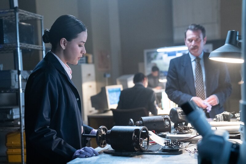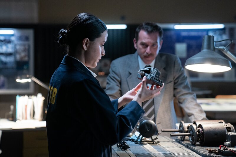 REENACTMENT - Der Labortechniker des NTSB (gespielt von Dianne Aguliar) und leitende Ermittler (gespielt von Jacob James) nimmt die Umschalteinheit von Air Illinois Flug 710 genauer unter die Lupe, um festzustellen, ob sie vor dem Absturz versagt hat. (Cineflix 2021/Shay Markowitz)