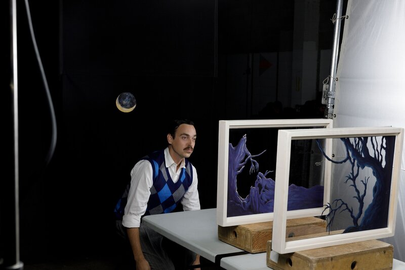 Der Stuhl des Regisseurs, die Kamera auf dem Stativ und die Lampe auf dem Tisch
