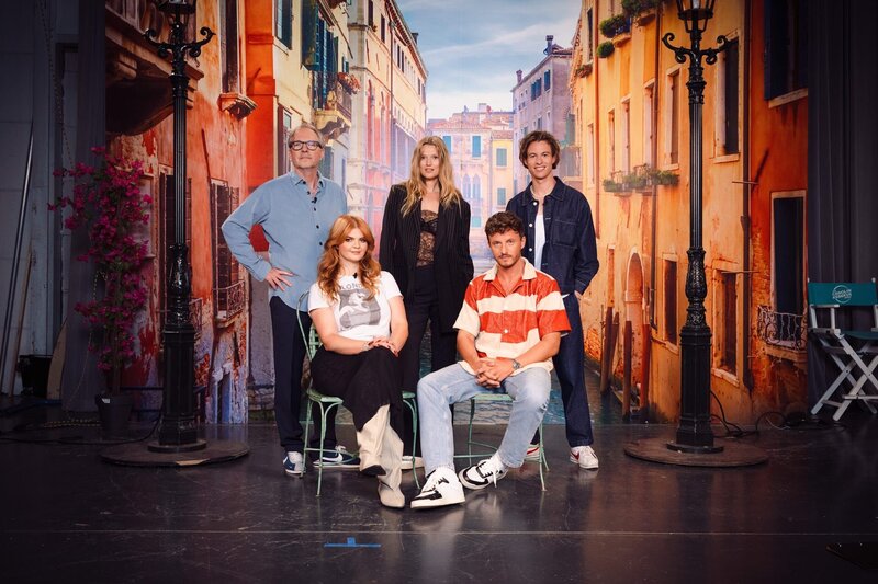 Starensemble in Bestform: Olli Dittrich (l.), Toni Garrn (M.) und Fred Rabe (r.) sind zu Gast bei Sophie Passmann (2.v.l.) und Tommi Schmitt (2.v.r.).