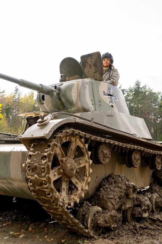Alex Churchill mit einem T-26-Panzer. Die sowjetische Armee setzte zwischen 1939 und 1944 Tausende von T-26-Panzern gegen Finnland ein (National Geographic/Ciaran Henry).