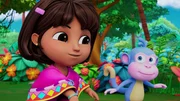 Dora erkundet mit dem Affen Boots und Backpack, dem sprechenden Rucksack, die Welt.