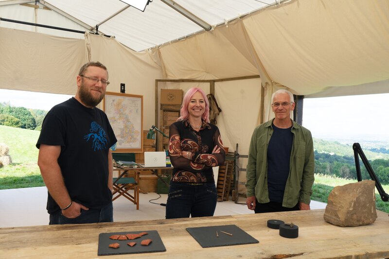 Die Archäologen Mathew Morris und John Thomas zeigen Alice ihre Funde im Zelt