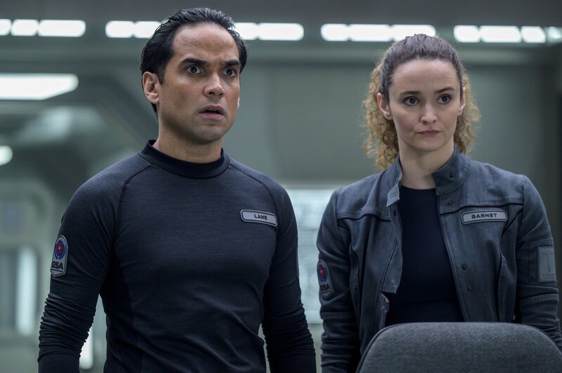 l-r: Dr. Sanjivni Kabir (Shalini Peiris), Dr. Marsh (Jadran Malkovich), und Kelly Fowler (Samantha Glassner)