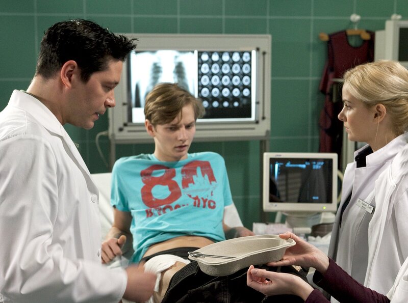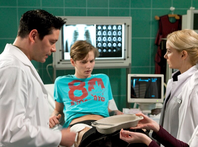 Als Dr. Philipp Brentano (Thomas Koch, links) die Schürfwunde von Rufus Fehn (Joseph K. Bundschuh) untersucht, entdeckt er, dass sich ein gefährlicher Gasbrand entwickelt hat. Brenatano macht Dr. Isabel Dahl (Denise Zich, rechts) Vorwürfe, Rufus nicht eingehend genug untersucht zu haben.