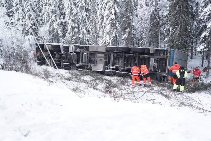 Der Fahrer kam zu nahe an den Fahrbahnrand, geriet ins Rutschen und blieb mehrere Meter von der Straße entfernt auf der Seite liegen.