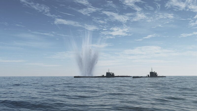 Explosion in der Nähe eines deutschen U-Boots durch eine amerikanische Avenger-Bombe in einem computergenerierten Bild. (Pazifikflotte II Productions Inc.)
