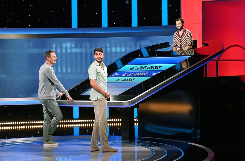ARD GEFRAGT - GEJAGT FOLGE 817 (WH.), "Alexander Bommes präsentiert beliebtes Quizformat", am Mittwoch (16.07.25) um 18:00 Uhr im ERSTEN. Moderator Alexander Bommes (l.) mit dem Kandidaten Schahin Javanmardi (2.v.l.) und dem Jäger Sebastian Klussmann (r.).Bild: © ARD/Arne Vollstedt