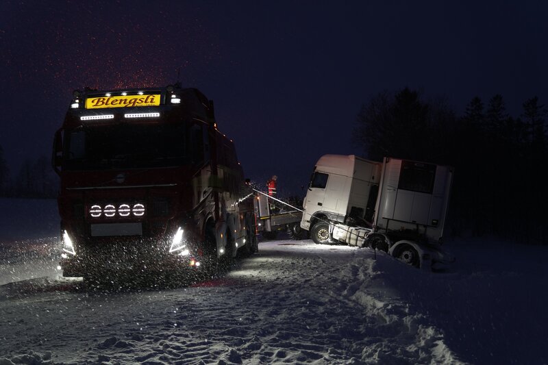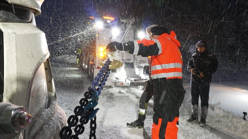 Thord begibt sich in große Gefahr: Er muss einen auf einer vereisten Gebirgsstraße verunglückten Vierzigtonner bergen, der in den Gegenverkehr zu rutschen droht.