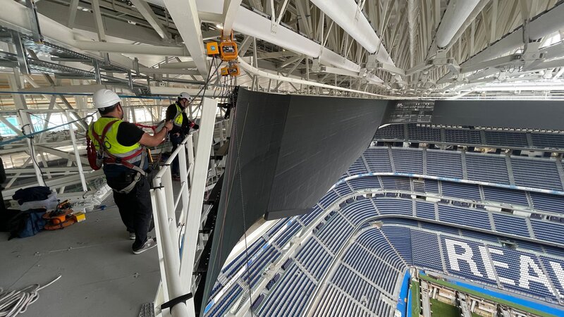 360°-Seitenbildschirme (so genannte Sticks, Seitenteile) werden im Santiago-Bernabéu-Stadion in Madrid auf die Anzeigetafel aufgesetzt.